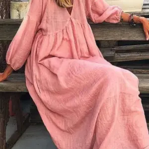 Pleated long-sleeved V-neck luxury solid color maxi dress